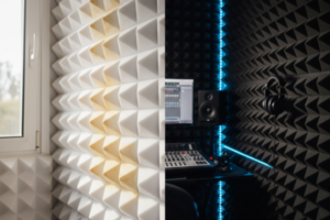 A espuma de melamina é um material de alta performance, muito usado em estúdios profissionais, teatros e ambientes corporativos.